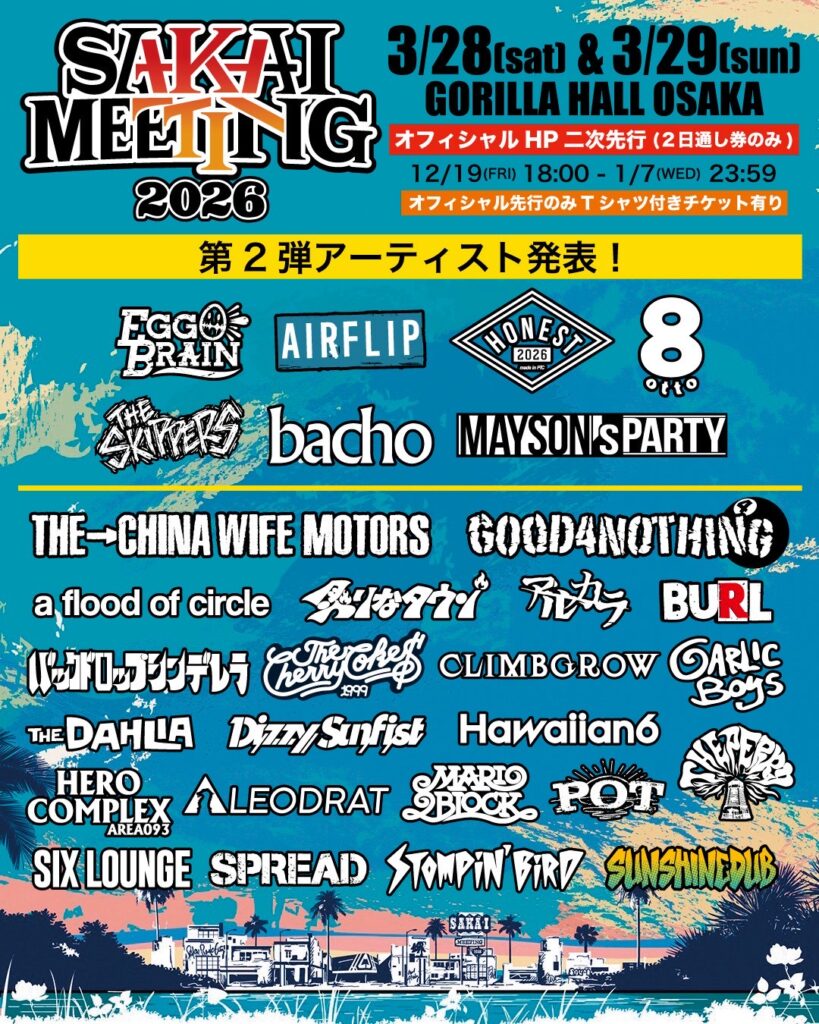 ![]() at GORILLA HALL OSAKA 2026年3月28日(土) open start 2026年3月29日(日) open start ※出演日は後日発表いたします。 MORE INFO… https://sakaimeeting.jp/2026/ TICKET INFO : https://t.pia.jp/pia/event/event.do?eventCd=2543005 GOOD4NOTHING & THE CHINA WIFE MOTORS 『SAKAI MEETING 2026』2026/03/28(土) & 03/29(日) |